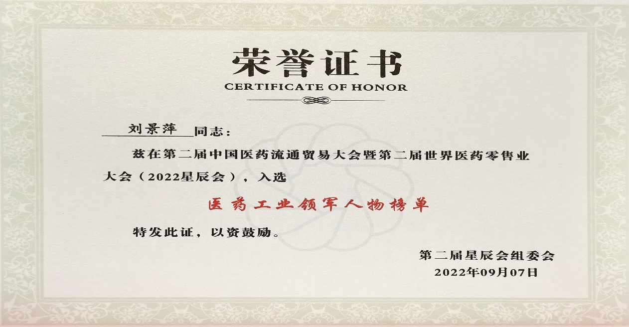 本次星辰会期间,巅峰国际斩获颇丰,获得多项行业奖项及荣誉。在开幕式上,刘景萍董事长荣获“医药工业领军人物”称号。